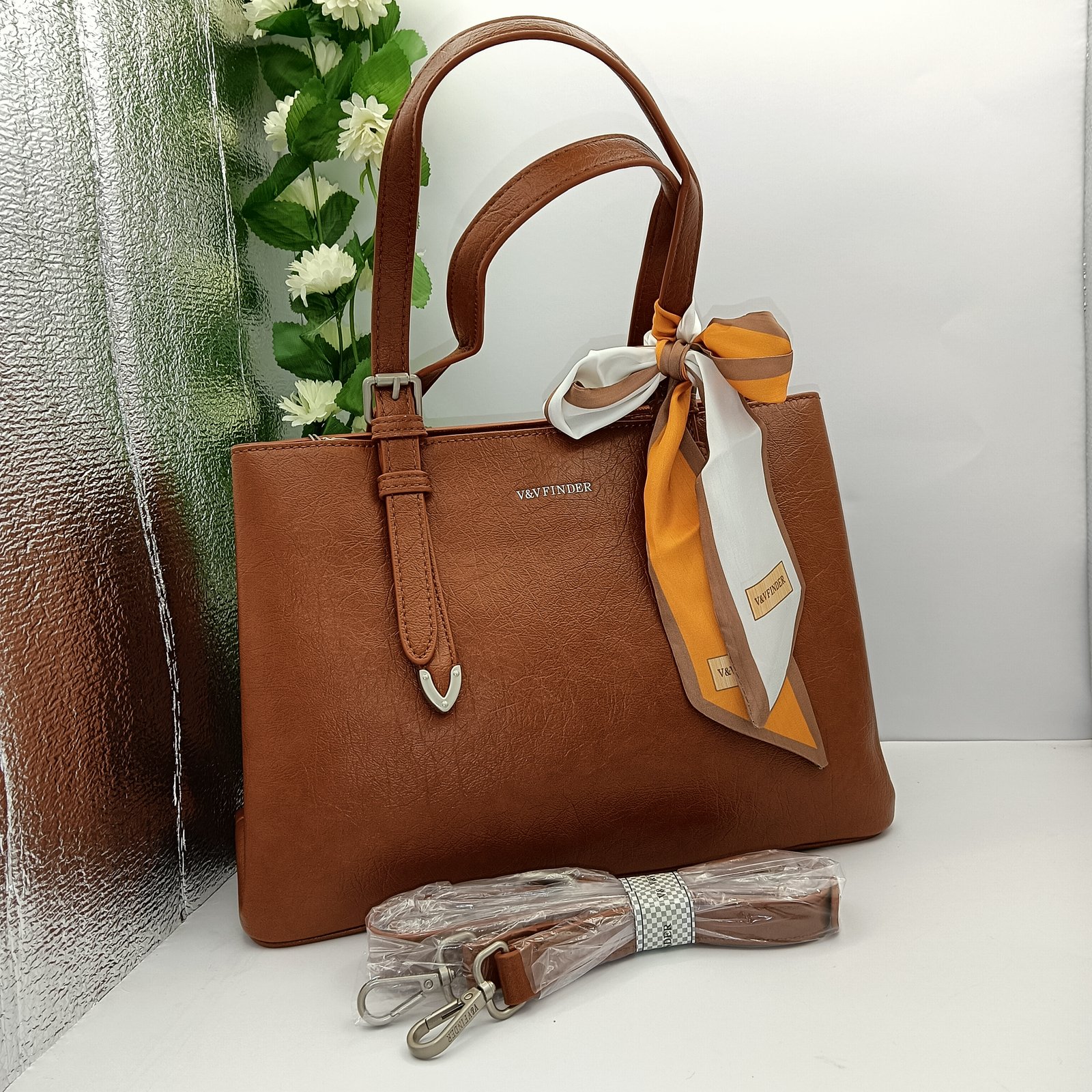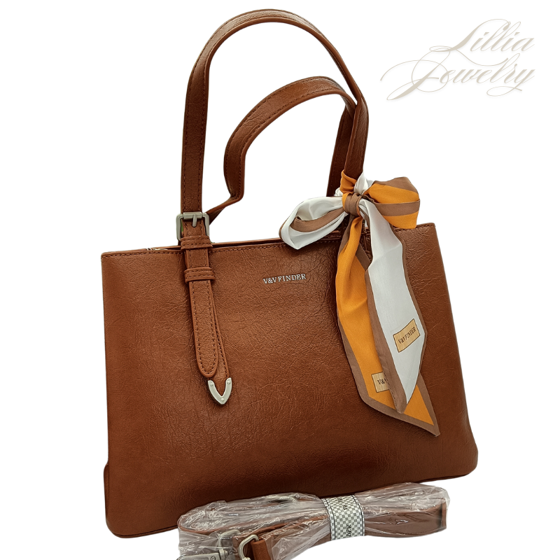 Dale un toque de elegancia a tu conjunto con este sofisticado bolso marrón V&V Finder. Fabricado con materiales de alta calidad, este bolso es tan resistente como elegante. Cuenta con cómodas asas, un interior espacioso y un pañuelo decorativo que le da un toque de color. El logotipo de V&V Finder refleja sutilmente el compromiso de la marca con la moda y la calidad. Este bolso tote es perfecto para el trabajo, los viajes o el día a día. ¡No te lo pierdas! ¡Pide el tuyo hoy mismo
